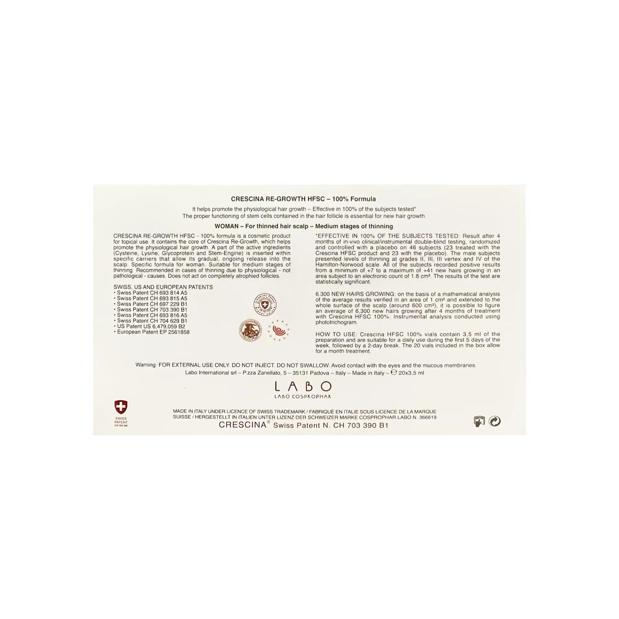 تتميز امبولات كريشينا بتركيبة مطورة وفعالة 100% فهي حاصلة على 8 براءات اختراع لقدرتها على إنبات بصيلات الشعر الضعيفة.