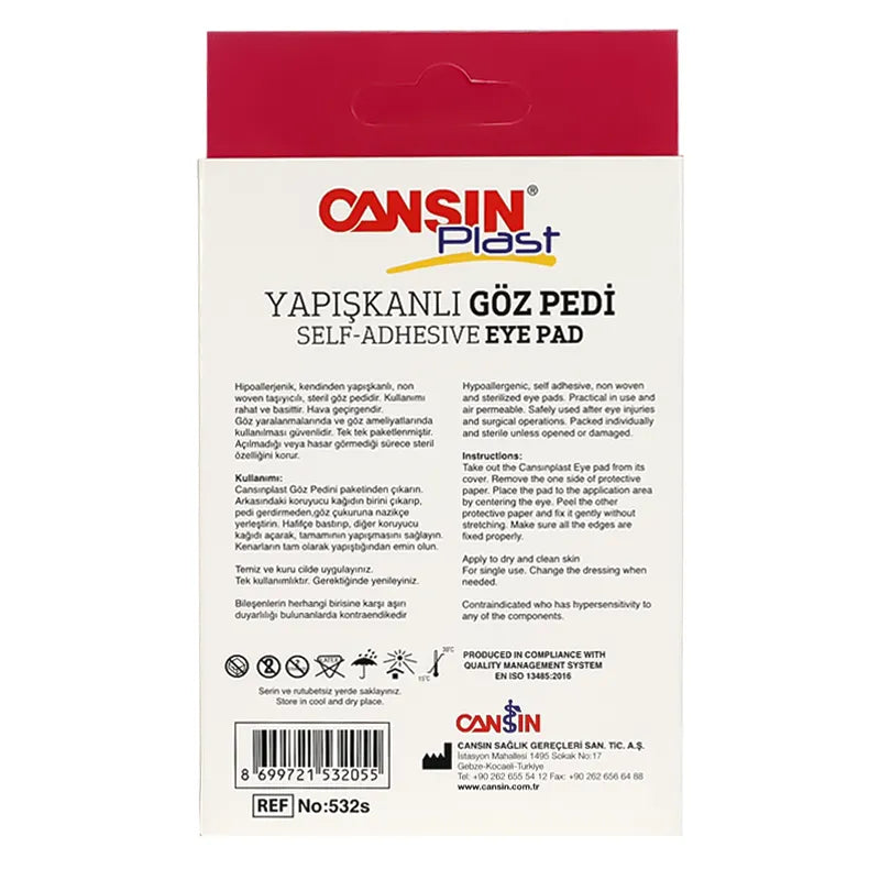 Cansin plast eye pads is a non-woven, self-adhesive, sterilized pad.